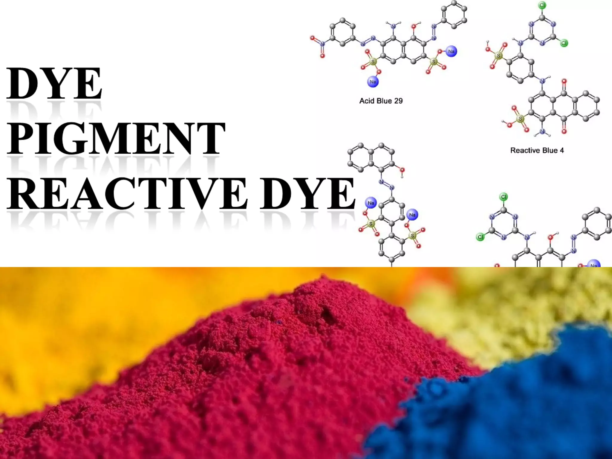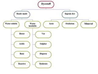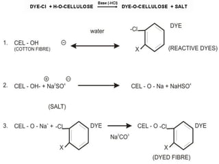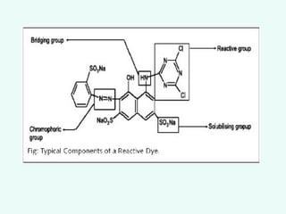 This document provides an overview of dyes and pigments, with a focus on reactive dyes. It defines dyes and pigments, describes their classification and color-producing factors. Reactive dyes are discussed in more detail, including their classification based on reactivity and reactive groups. The process of reactive dyeing is summarized, including dyeing conditions, the approach of reactive dyes to fibers, and their chemical reaction with cellulose fibers. A sample process curve is also shown. Finally, the document provides a profile of a wet processing plant to illustrate dyeing operations.