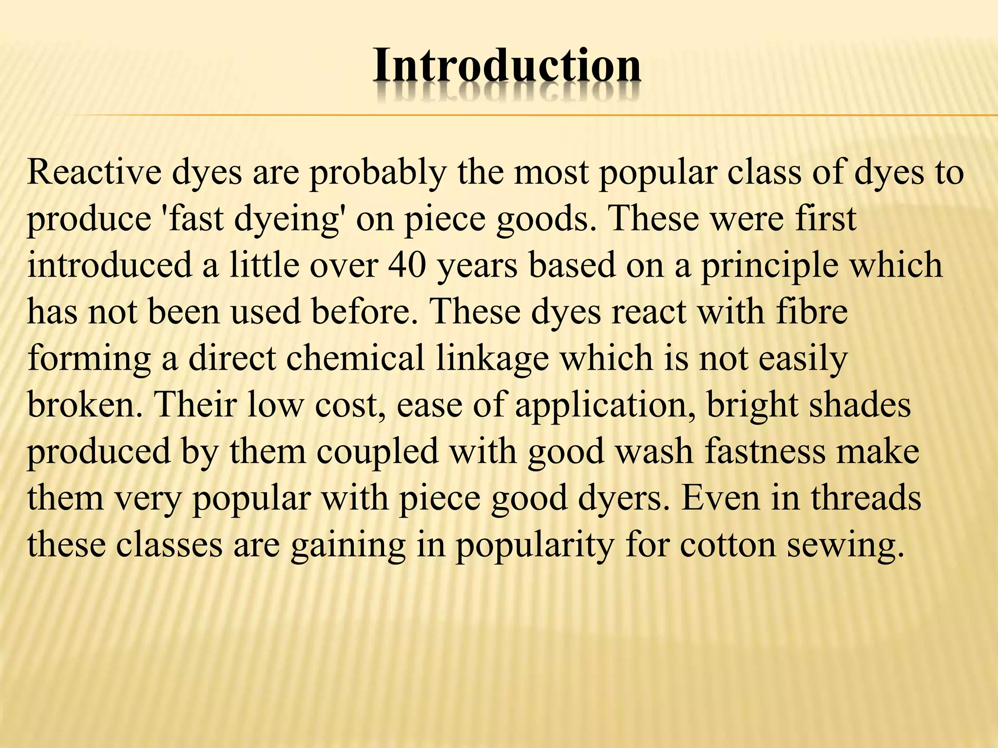 1. Reactive dyes form covalent bonds with cotton fibers through reaction groups, making them very colorfast.