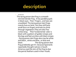 The dying poison dart frog is a slender, black frog with golden stripes and blue legs and feet. It lives in forests in Amazonia and the Guyanas. It eats ants and termites, and secretes toxic alkaloids from its skin that serve as a defense against predators and come in bright warning colors. The female lays small clutches of 2-10 eggs on leaves or the ground, and the tadpoles develop on the backs of the parents before metamorphosing over 8-12 weeks. While poisonous, these frogs are not currently threatened in the wild, though some species are vulnerable. Their toxins are also being studied for potential medical applications.