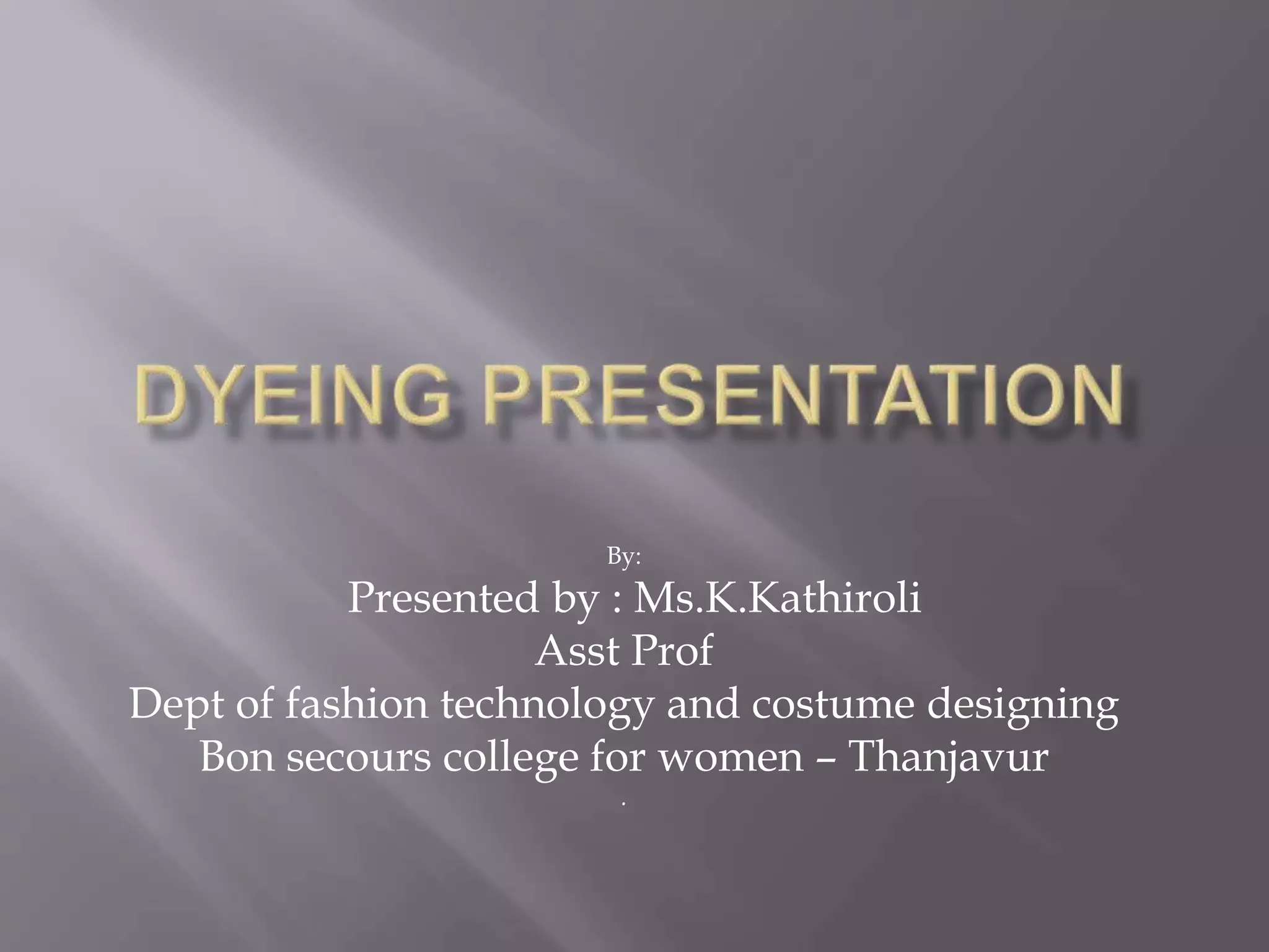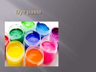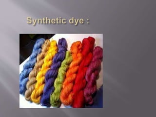 The document discusses different types of dyes used for textiles, including their chemical properties and fibers they can be used on. It covers natural dyes obtained from plants as well as synthetic dyes developed later. Key dye types discussed include reactive dyes, which chemically bond to cellulose fibers; vat dyes, which are applied in vats and can be used on cotton, wool and leather; acid dyes used for protein fibers like wool; and basic dyes also used for wool and silk. The document provides details on characteristics and applications of different dyes.