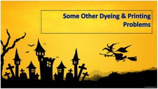 3. Dyeing problems like unlevelness, cloudiness, pale areas, and lack of reproducibility can result from many factors including unstable dyes, unsuitable dye combinations, imperfect pretreatment, fiber variations, and inconsistent dyeing programs or conditions. Attention to fiber properties and dyeing procedures is important to address common defects.