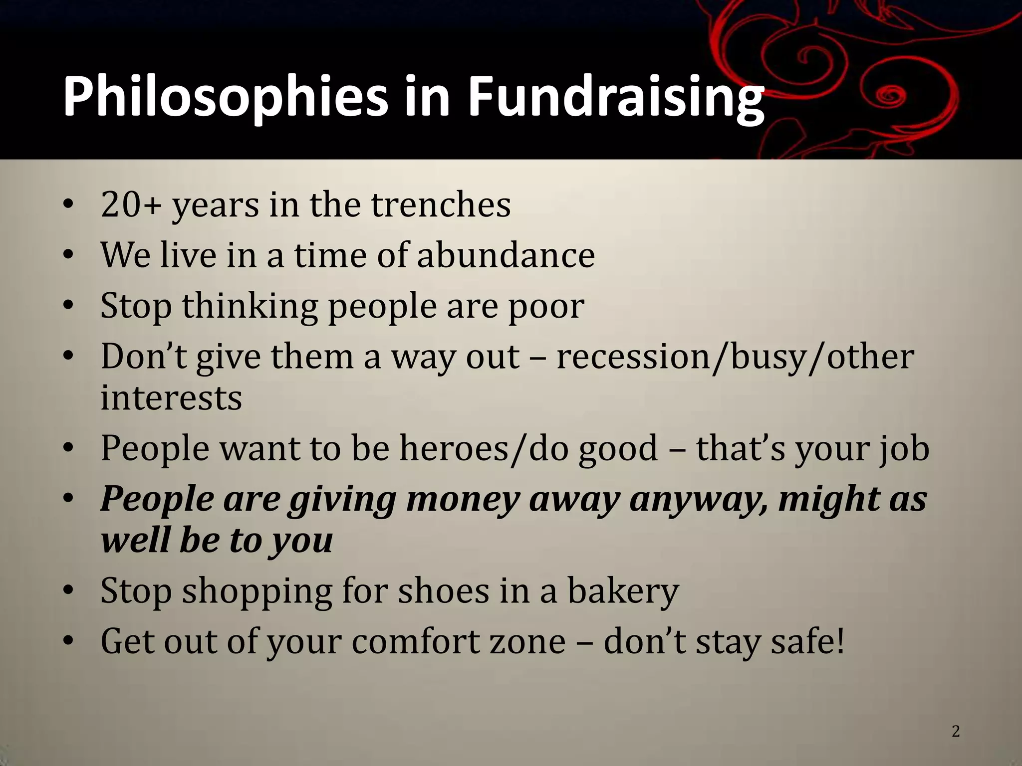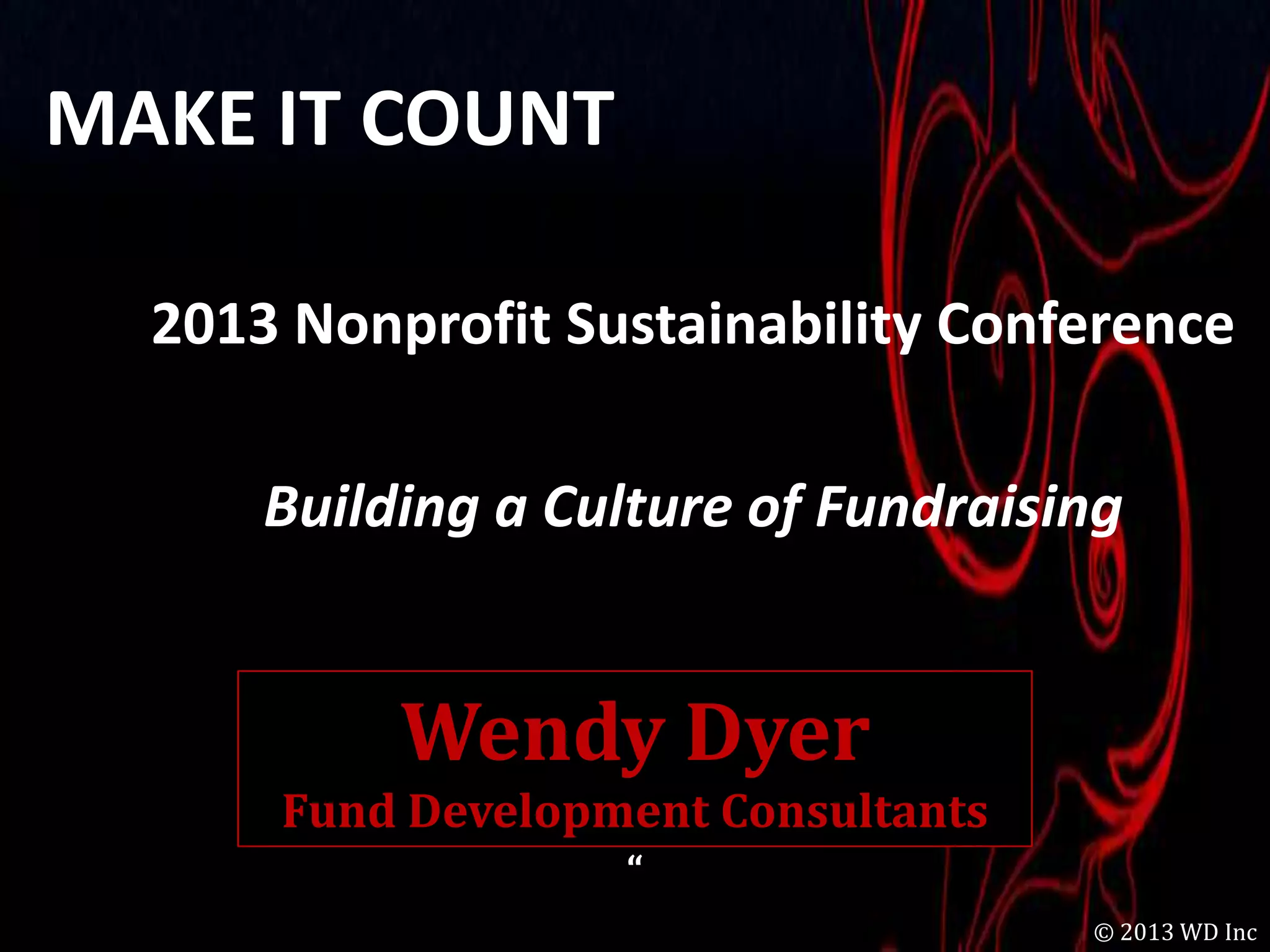 Wendy Dyer presented at the 2013 Nonprofit Sustainability Conference on building a culture of fundraising. In her presentation, she made several key points: