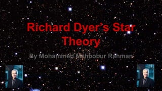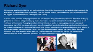 Richard Dyer developed the Star Theory to analyze how pop stars are constructed images rather than real people. Pop stars have carefully crafted personas designed to attract audiences and generate revenue. Rihanna exemplifies this as her persona evolved from "good girl" to "bad girl" through her explicit music videos and relationships. She attracts large audiences by collaborating with other stars and changing her image to keep fans engaged. Pop stars like Rihanna are manufactured by record labels to create trends that maximize profits from music, concerts, and merchandise.