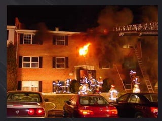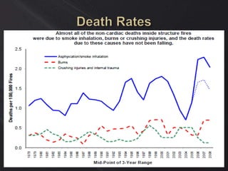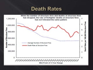 The document outlines the increasing death and injury rates of firefighters during structure fires, detailing key statistics and case studies from various incidents. It discusses issues such as asphyxiation, rapid fire growth, and the need for better equipment and operational strategies to enhance firefighter safety. Recommendations are provided for improving training, communications, and standard operating procedures to mitigate these risks.