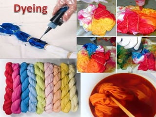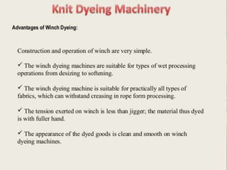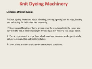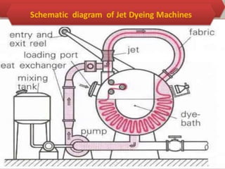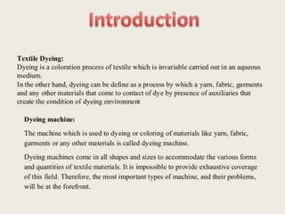 The document discusses different types of textile dyeing machines and their uses. It describes beam dyeing machines, which dye yarn or fabric wound onto a beam, maintaining even tension. Sample dyeing machines are used to dye small amounts of fiber, yarn or fabric efficiently. Yarn dyeing machines loosely wind yarn onto perforated tubes for uniform dye penetration. Knit fabrics are often dyed using jet dyeing machines, which allow for low water use, short dyeing times, and gentle fabric handling. Woven fabrics may be dyed using jigger or paddle batch machines.