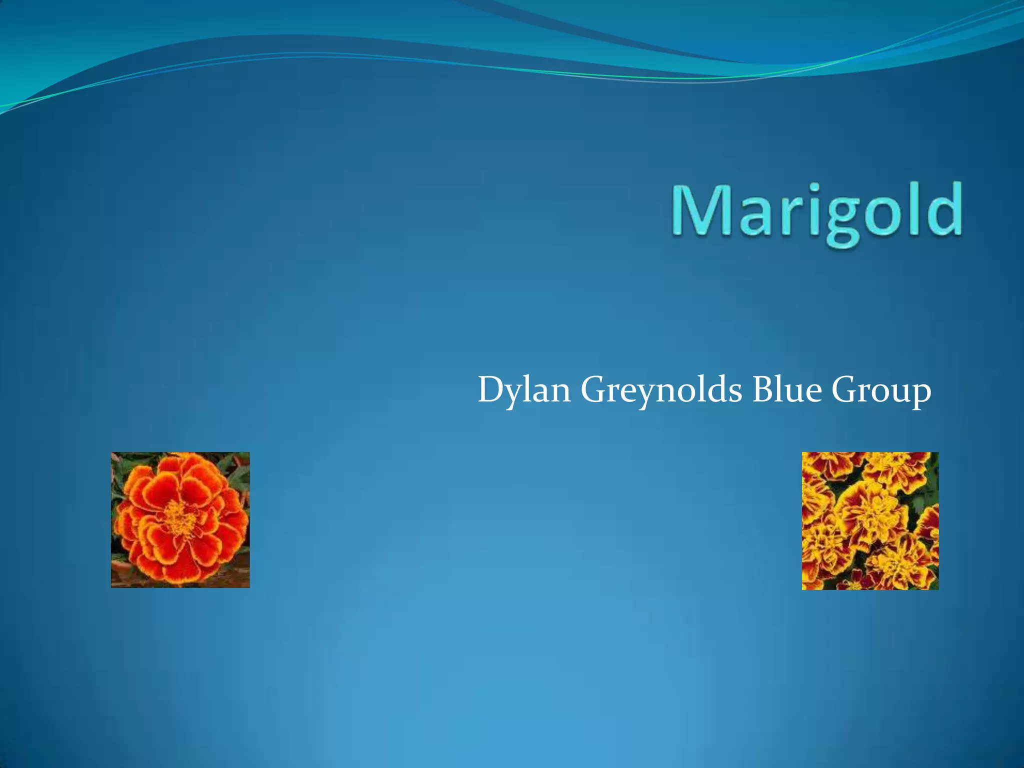 The marigold flower grows one to two feet tall, is orange and yellow in color, and smells bad to repel insects. It thrives in rich, well-drained soil in a tropical climate with full sun and water. Marigolds can treat conjunctivitis, eczema, gastritis, minor burns and warts, and protect cells from chemical damage. They also help treat some skin diseases when grown properly with many blooms and branches.