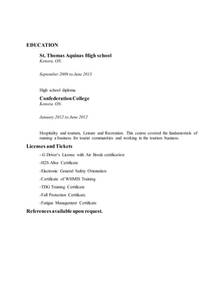 Dylan Riley Hall has over 2 years of experience as a floorhand and derrickhand for Sun Country Well Servicing, where he assisted in tasks, safety meetings, and equipment maintenance. He also has experience as a field technician for TBT Engineering, where he focused on safety and efficient job completion. He has a high school diploma as well as hospitality and tourism training. His licenses and certificates include air brake certification and certificates in safety, transportation of dangerous goods, and fatigue management.
