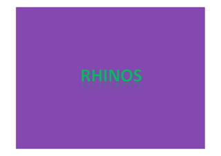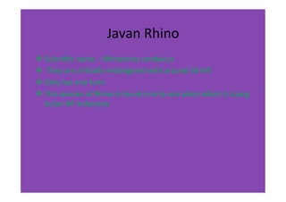 The document provides information on four rhino species: the Javan rhino, black rhino, white rhino, and Indian rhino. It lists their scientific names and key details about their population numbers, horn quantity, geographical locations, and other distinguishing characteristics. The Javan rhino has approximately 50 individuals remaining and is only found in one location in Indonesia. The black rhino has around 3,610 surviving individuals in southwestern Africa. The white rhino is the only non-endangered rhino with about 11,330 total, found in Northern Africa. The Indian rhino is critically endangered with roughly 2,500 remaining in Southeast Asia.