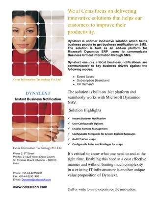 Cetas provides innovative solutions to enhance customer productivity, highlighting Dynatext, an add-on platform for Microsoft Dynamics ERP that delivers critical business notifications via SMS. This solution offers instant notifications, user configurations, remote management, and secure message templates. Dynatext aims to simplify IT infrastructure while maintaining cost-effectiveness.