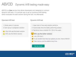 The document discusses dynamic A/B testing using a service called AB/CD. It explains that traditional A/B testing divides users into static groups to test different buttons or options, but this is costly if a large number of users is needed. Dynamic A/B testing addresses this by initially giving 10% of users a random option and then routing 90% of users to the best performing option based on metrics like views, clicks and click-through rate. This allows conclusions to be drawn more quickly using fewer users. AB/CD is a service that handles the calculations behind dynamic A/B testing, allowing options to be requested via API and results reported back in real time.