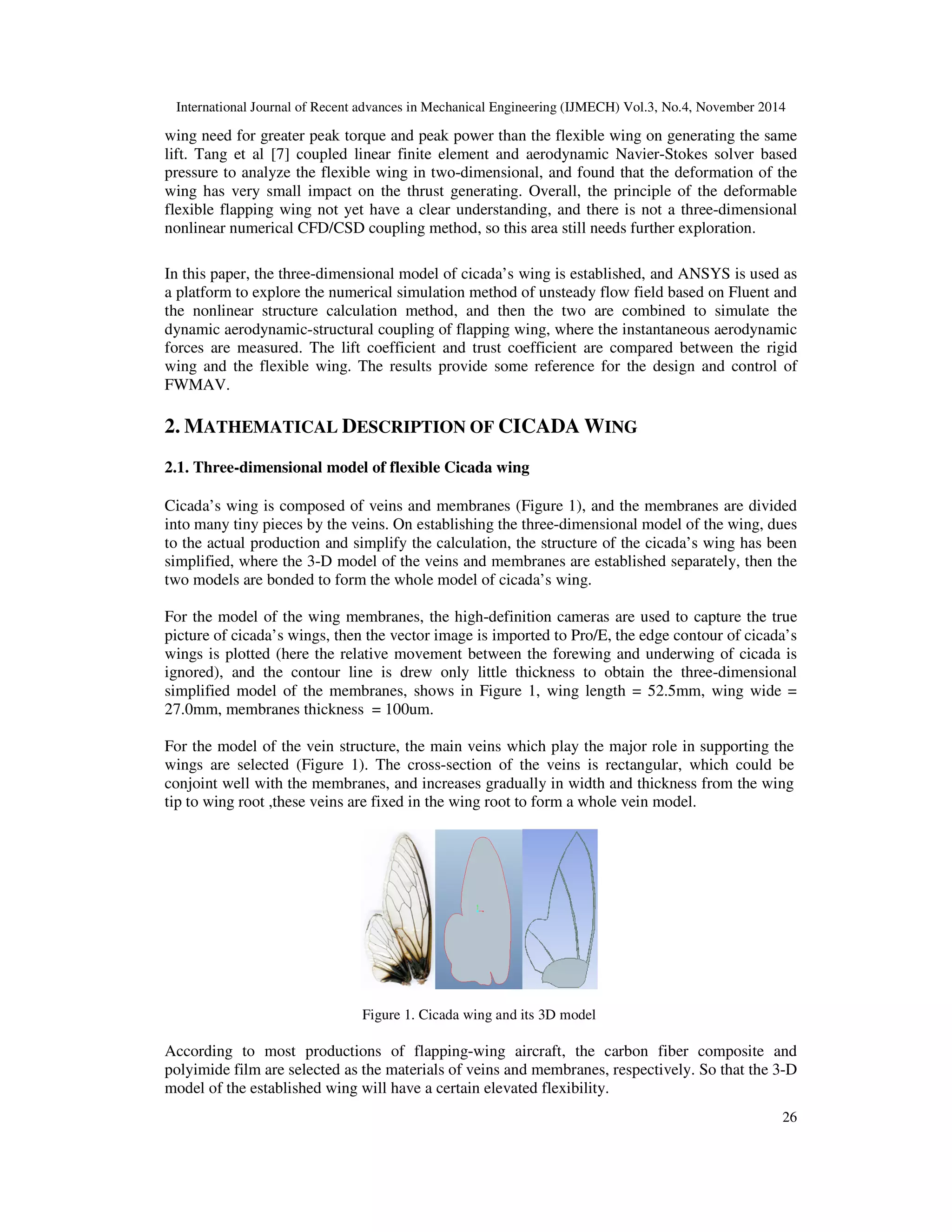 This paper presents a numerical simulation method for dynamic aerodynamic-structural coupling of a cicada's flexible wing using ANSYS. The study establishes a three-dimensional model of the wing and investigates the interactions between unsteady flow and structural dynamics, finding that flexible wings can enhance aerodynamic performance compared to rigid wings. The results offer insights that could benefit the design and control of flapping-wing micro air vehicles.