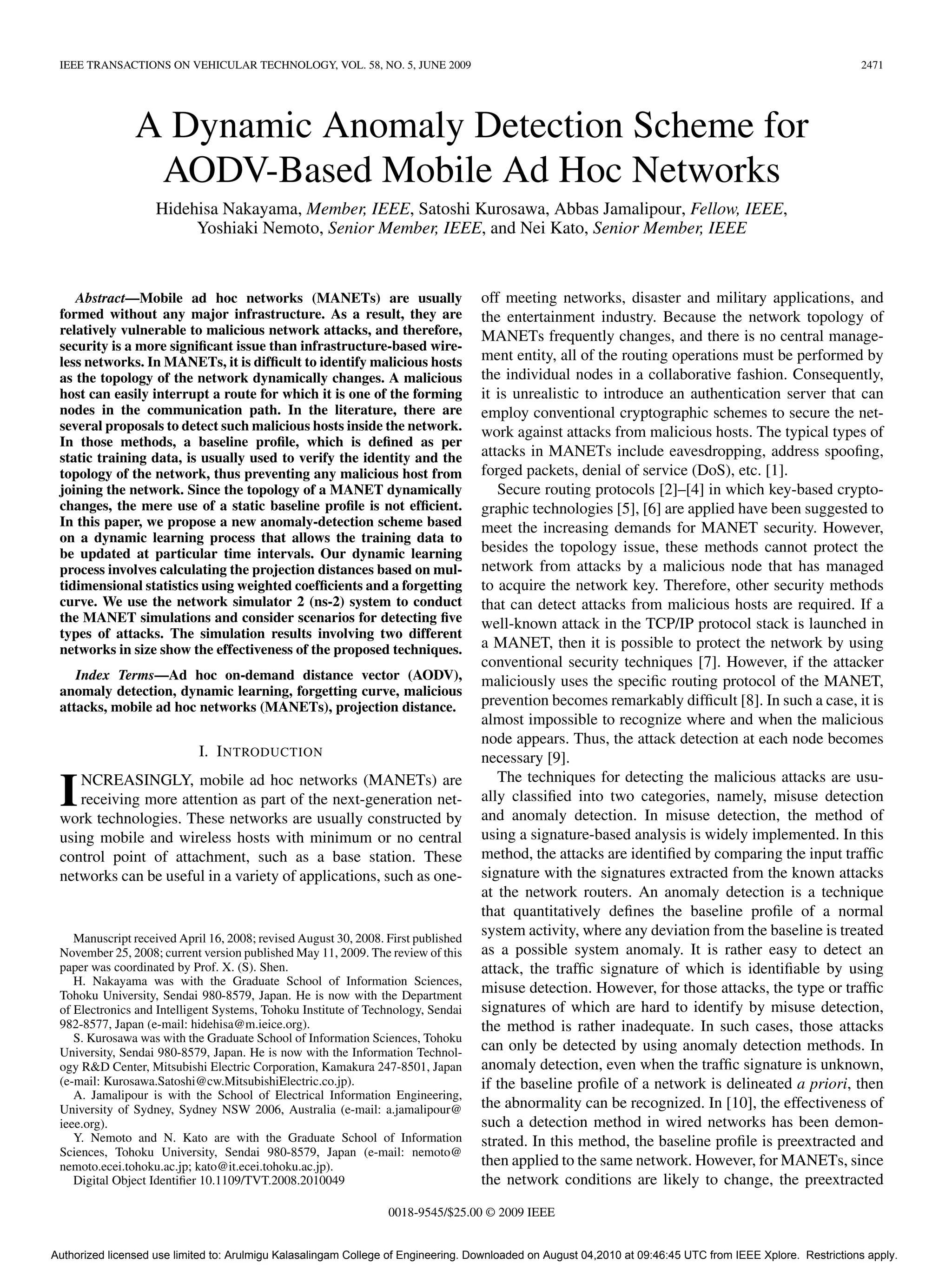 1) This document proposes a new anomaly detection scheme for mobile ad hoc networks (MANETs) based on dynamic learning.