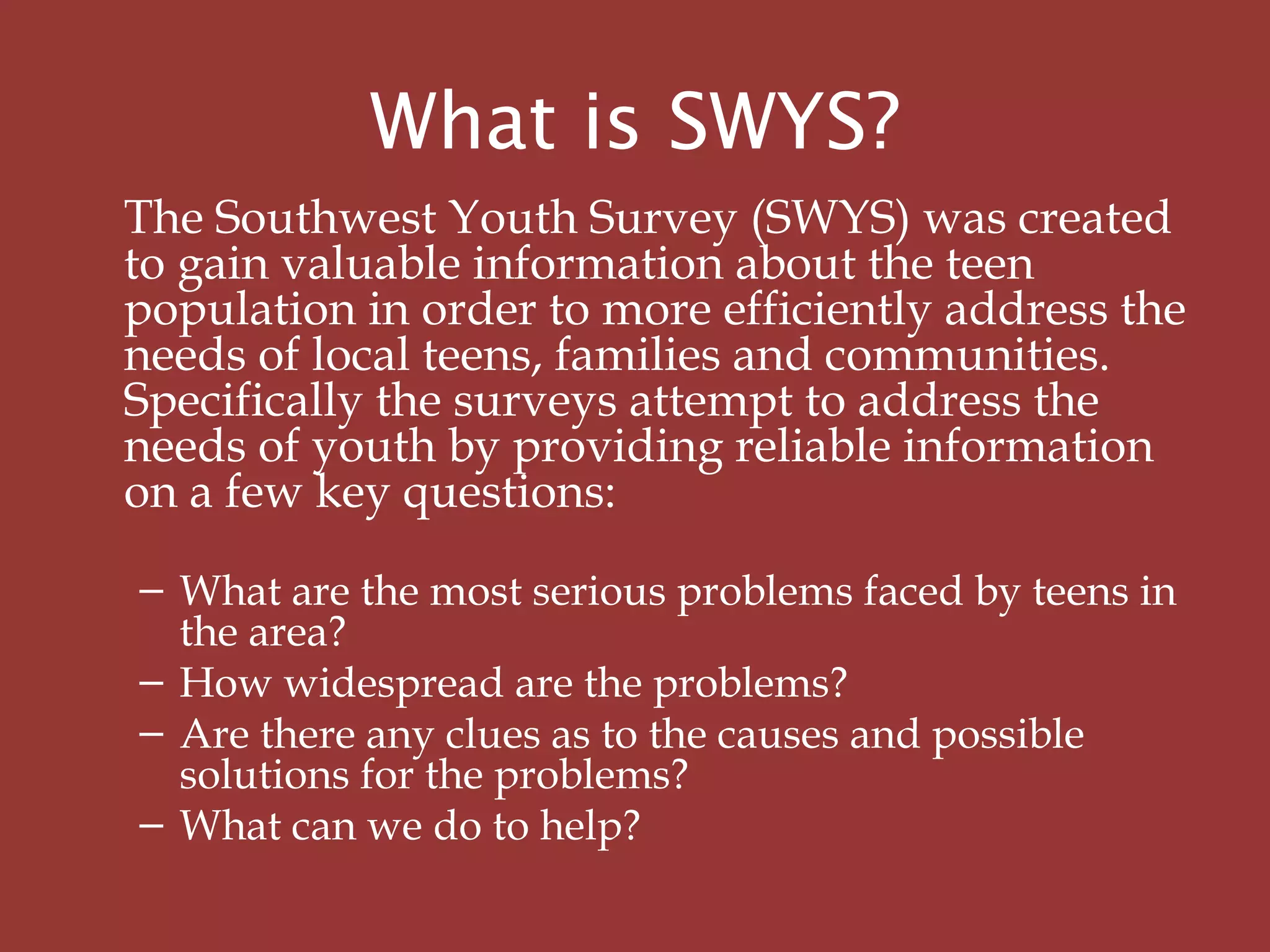 The Southwest Youth Survey (SWYS) was created to gain information about teens' needs in local communities. It began in 1989 surveying 1,440 students across 6 schools in 1 county. Over time, it expanded to survey over 5,700 students across 19 schools in 3 counties by 1997. The survey addresses key issues like problems faced by teens, their prevalence, and possible solutions. Results are shared through a website, newsletters for parents, presentations to organizations, and a full report. Challenges include collaborating across counties, maintaining confidentiality, analyzing results, and keeping audiences engaged with sometimes "stale" data.
