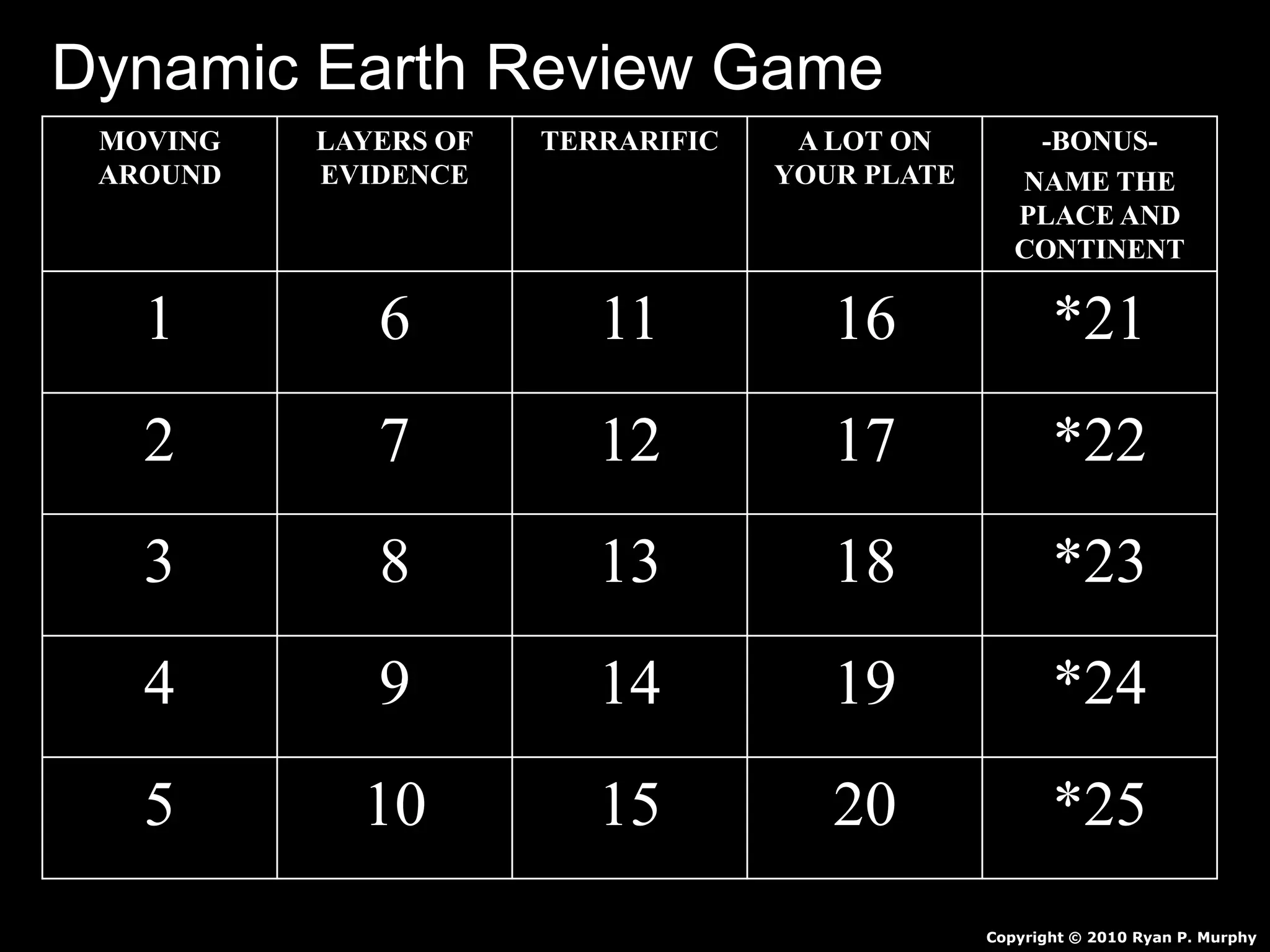 The document outlines rules and questions for a dynamic earth review game focused on geological theories such as plate tectonics and continental drift. It includes instructions for group participation, points allocation for questions, and a final wagering question about crust composition. Additionally, it explores evidence for continental drift and geology concepts like seismic waves and earth's interior composition.