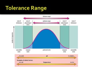 This document discusses dynamic ecosystems, including abiotic and biotic factors, stratification due to varying conditions, intertidal zonation, qualitative and quantitative data collection, geographic range and distribution of organisms, population sampling techniques like transects and quadrats, and capture-mark-recapture estimates of mobile species populations. It also covers density, carrying capacity, and a example calculation to estimate a frog population using the capture-mark-recapture method.
