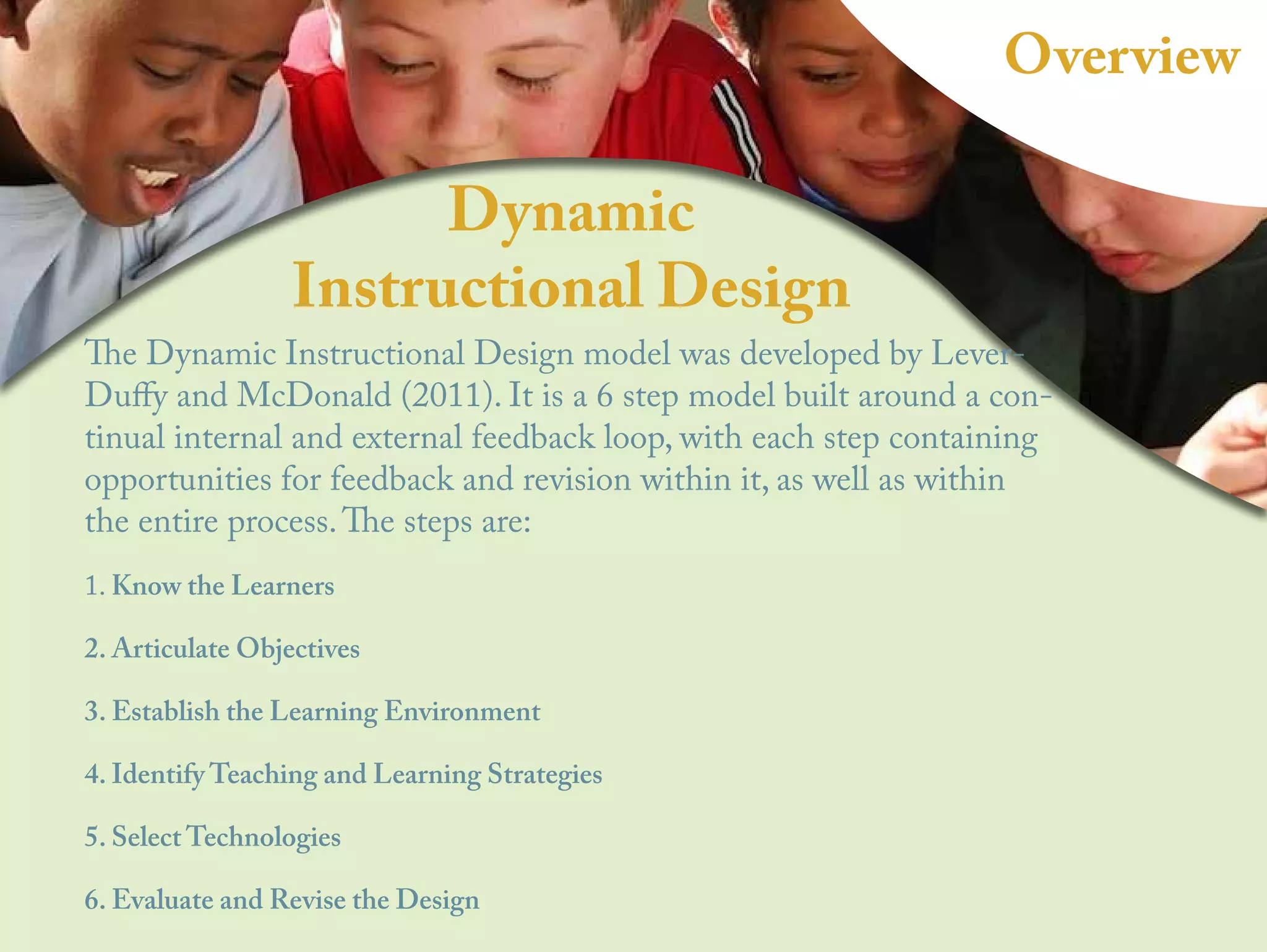 The Dynamic Instructional Design (DID) model is a 6-step iterative process for instructional design based on continual feedback. The 6 steps are: 1) Know the Learners, 2) Articulate Objectives, 3) Establish the Learning Environment, 4) Identify Teaching and Learning Strategies, 5) Select Technologies, and 6) Evaluate and Revise the Design. Each step contains opportunities for feedback and revision within the step and across the entire process. The goal is to continually improve the design based on assessment of student learning and reflection on the design process.