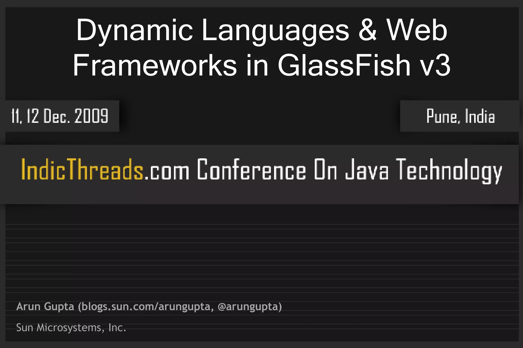 The document discusses dynamic languages and web frameworks supported by GlassFish v3, including Ruby, Grails, and Jython, emphasizing their capabilities and integration with the server. It outlines the benefits of using dynamic languages such as agility in development, conventions, and reduced configuration complexity. Additionally, it covers deployment methods and performance optimizations for these frameworks within the GlassFish environment.