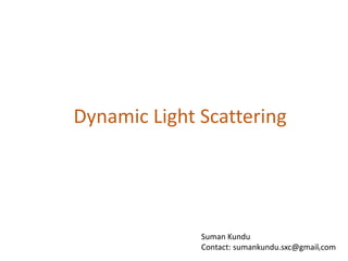 Dynamic light scattering measures the fluctuation changes in the intensity of scattered light to determine particle size and properties. It works by measuring the rate at which the intensity of scattered light fluctuates due to Brownian motion of particles. Larger particles diffuse more slowly than smaller particles, so intensity fluctuations are slower for large particles. The correlation function contains information about particle diffusion, with steeper curves indicating more monodisperse samples and more extended decay indicating greater polydispersity. Dynamic light scattering can determine particle size distribution, hydrodynamic radius, and diffusion coefficient.