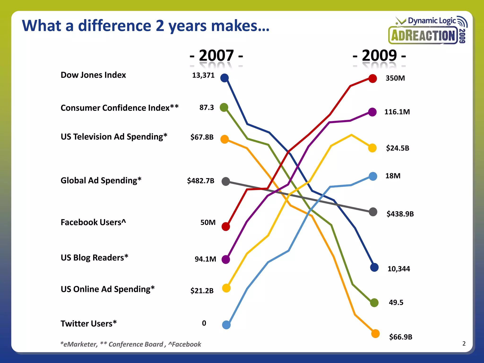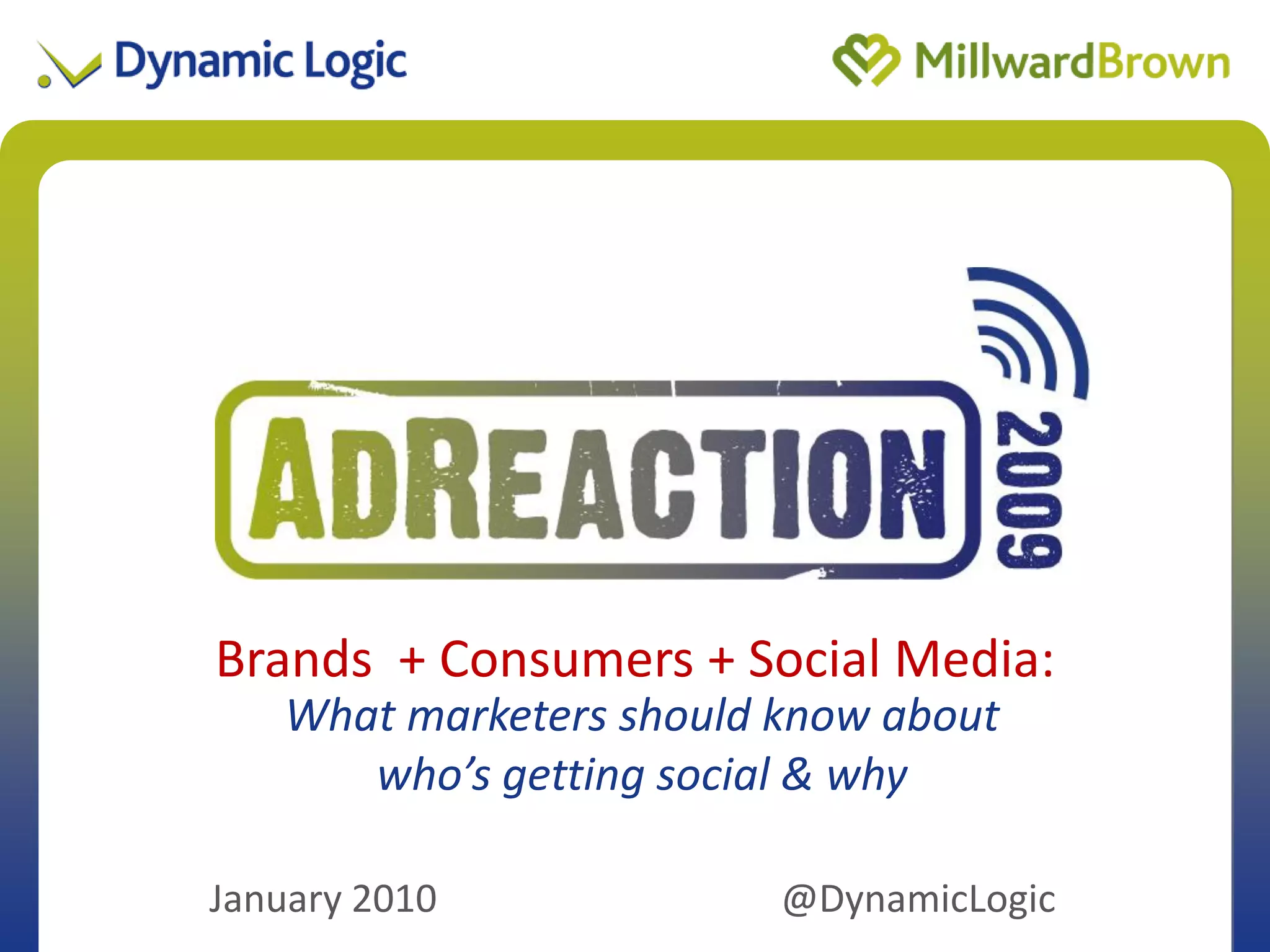 The document presents findings from Dynamic Logic's Adreaction 6 study on social media's impact on consumer behavior and advertising. It highlights a significant increase in social media participation across various age groups, particularly showing Facebook and Twitter as the most frequented platforms. Marketers are encouraged to consider the diverse motivations and attitudes of social media users towards advertising and their relationships with brands.