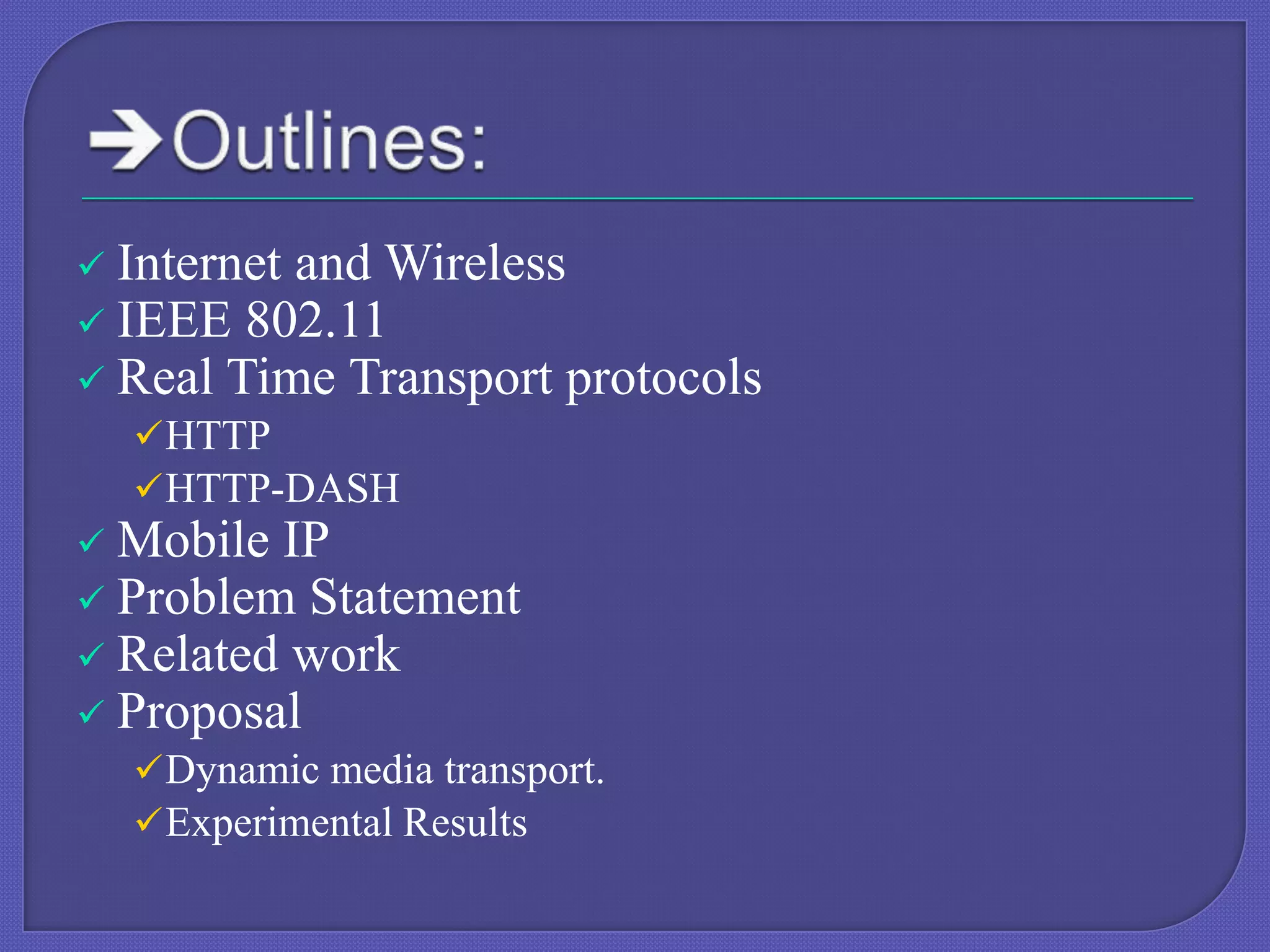 The document discusses internet and wireless technologies such as IEEE 802.11, HTTP, and Mobile IP. It describes experiments on dynamic media streaming over wireless networks using different transport protocols like TCP and PRRT. The experiments showed that TCP suffers from throughput variations on wireless networks leading to underutilization of bandwidth. In contrast, PRRT, which implements predictably reliable transport, was able to optimize bandwidth utilization for media streaming over wireless and mobile internet paths.