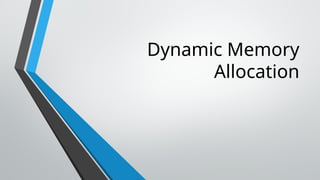 The document explains dynamic memory allocation (DMA) in C, which allows memory to be allocated at runtime through functions such as malloc(), calloc(), realloc(), and free() from the stdlib.h header file. It contrasts DMA with static memory allocation, highlighting that the latter occurs at compile time and cannot be changed during execution. An example demonstrates the use of these functions to manage memory for an array dynamically.