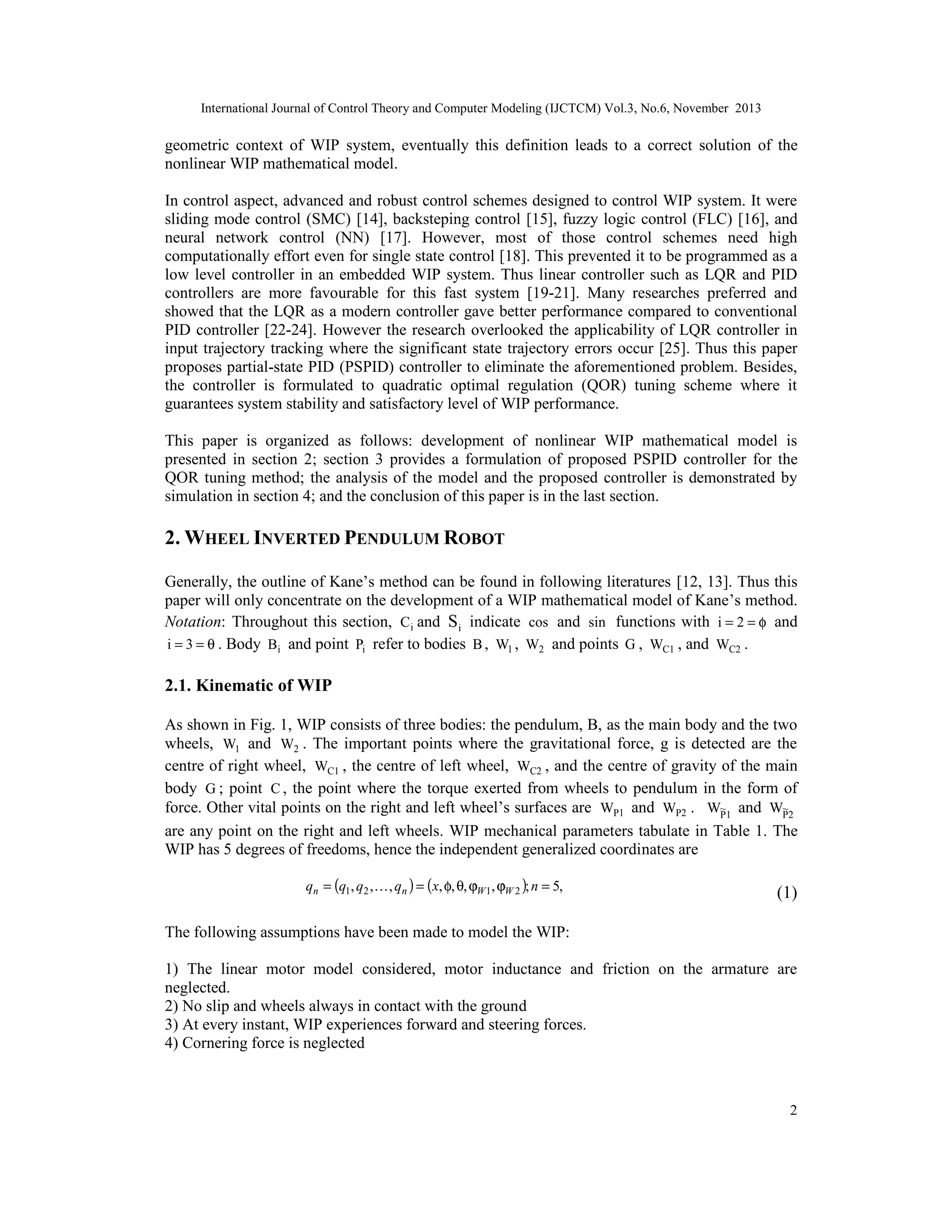 This document presents a detailed analysis of the dynamic modeling and optimal control scheme for a wheel-inverted pendulum (WIP) intended for mobile robot applications. It employs Kane's method to derive a nonlinear mathematical model and proposes a partial-state PID controller using quadratic optimal regulation for improved performance. The paper emphasizes the significance of the WIP system in both industrial and research contexts, highlighting its potential as a future urban robot and transporter.