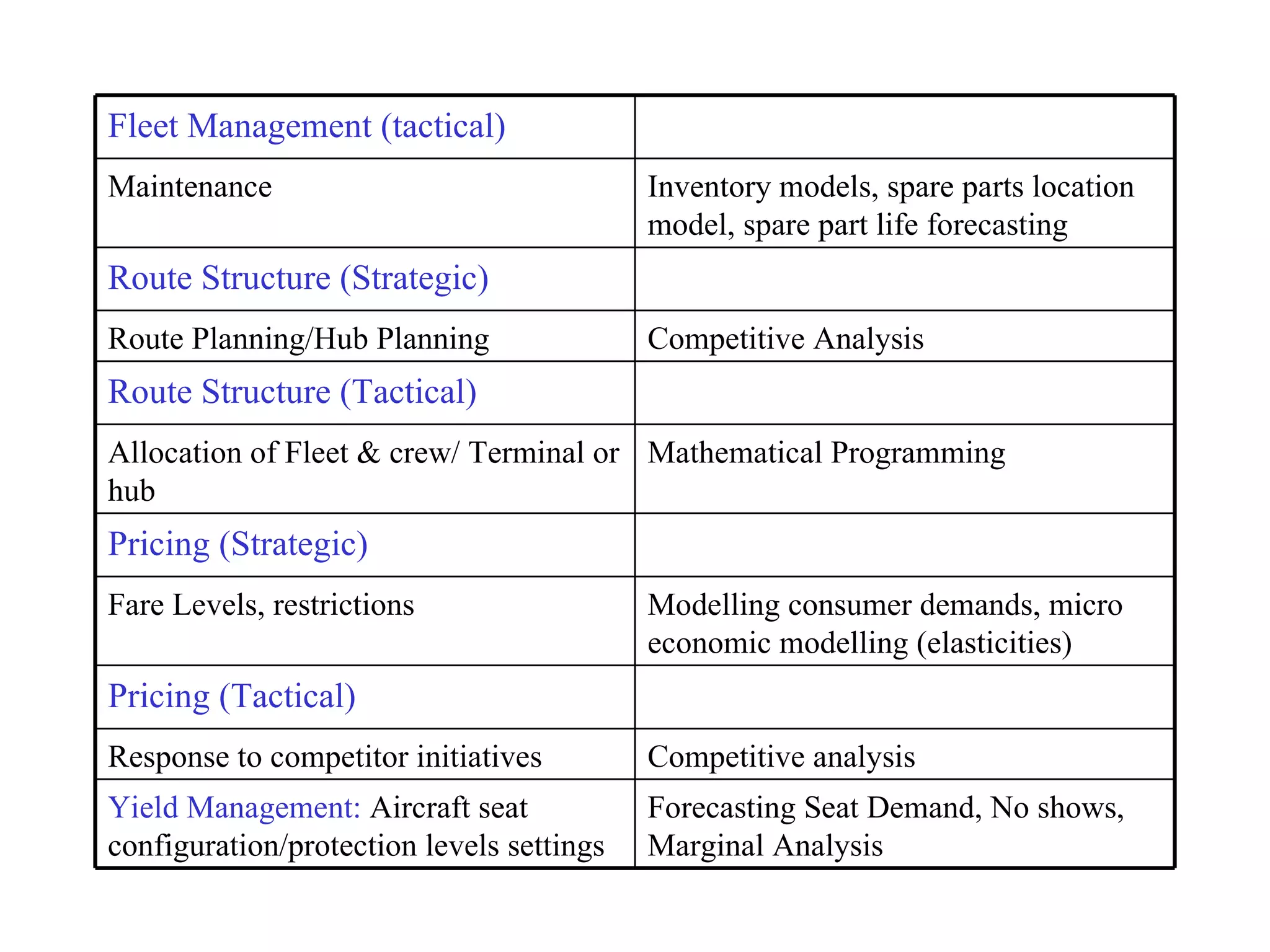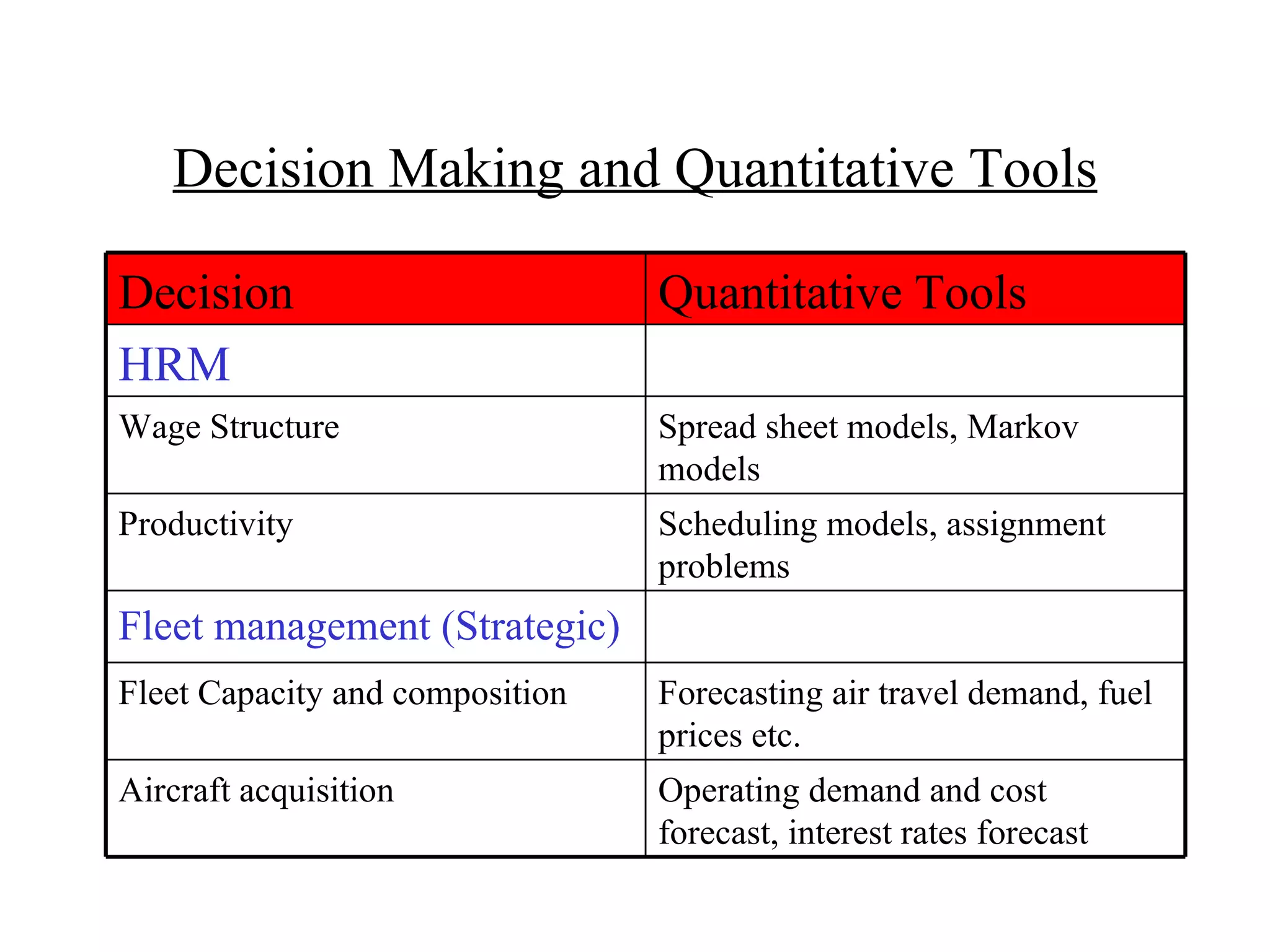 The document discusses various quantitative tools used in airline revenue management and decision making. It covers topics like demand forecasting, fleet management, scheduling models, pricing concepts, yield management, and competitive analysis. Yield management involves clustering fare classes into buckets based on price and adjusting authorized seat levels for different fare classes based on forecasted versus actual demand trends. Key factors considered in airline yield management calculations include fare levels, restrictions, passenger demand elasticities, and market-specific conditions.