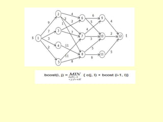 The document describes several algorithms that use dynamic programming techniques. It discusses the coin changing problem, computing binomial coefficients, Floyd's algorithm for finding all-pairs shortest paths, optimal binary search trees, the knapsack problem, and multistage graphs. For each problem, it provides the key recurrence relation used to build the dynamic programming solution in a bottom-up manner, often using a table to store intermediate results. It also analyzes the time and space complexity of the different approaches.