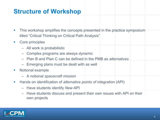 The document outlines a workshop focused on dynamic schedule management principles, emphasizing the probabilistic nature of project work and the importance of alternative points of integration. It discusses managing uncertainty in schedules through critical path analysis and the effects of different subsystems in a spacecraft development program. Key concepts include understanding risks, using probabilistic analysis for effective planning, and the critical role of well-structured schedule data in project success.