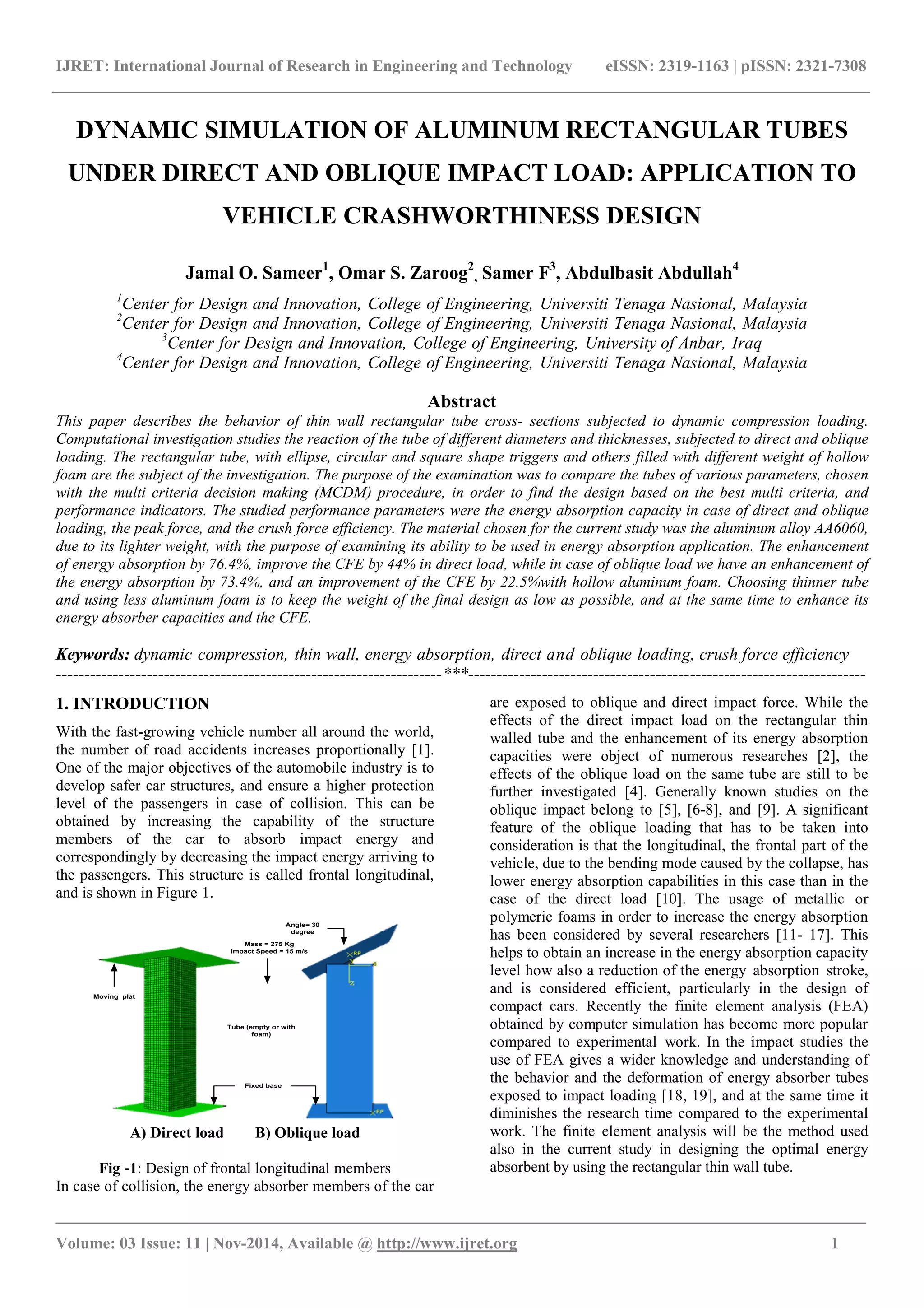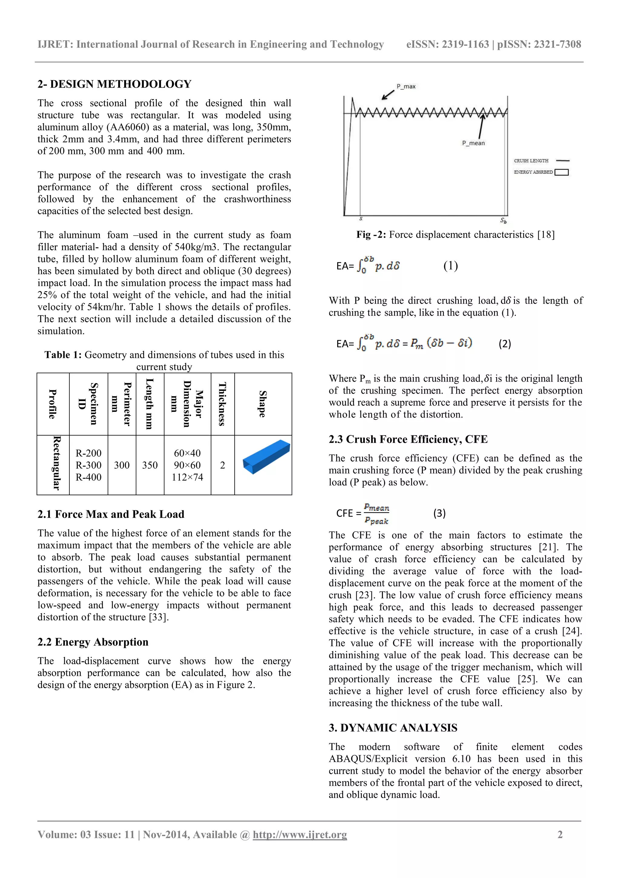 This document summarizes a study that used dynamic simulation to analyze the behavior of rectangular aluminum tubes under direct and oblique impact loads. It investigated tubes of various diameters, thicknesses, and foam fill weights. The objectives were to compare performance parameters like energy absorption capacity, peak force, and crush force efficiency (CFE) to identify the optimal design. Simulation results showed that tubes with hollow aluminum foam had up to 76.4% higher energy absorption, 44% higher CFE under direct loads, and 73.4% higher energy absorption and 22.5% higher CFE under oblique loads compared to empty tubes. Choosing thinner tubes and less foam helped minimize weight while still enhancing energy absorption and CFE.