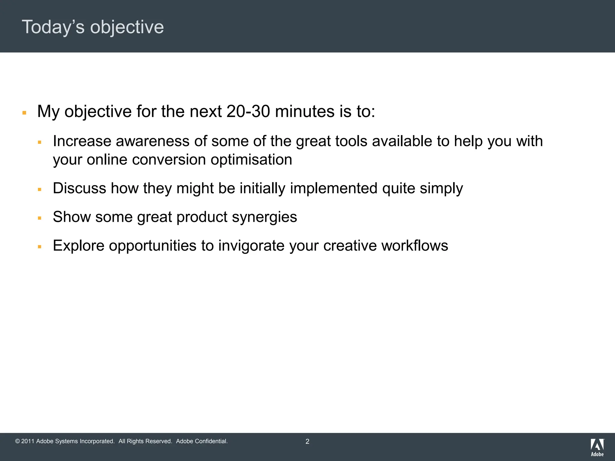 My objective for the next 20-30 minutes is to: Increase awareness of some of the great tools available to help you with your online conversion optimisation Discuss how they might be initially implemented quite simply Show some great product synergies Explore opportunities to invigorate your creative workflows © 2011 Adobe Systems Incorporated. All Rights Reserved. Adobe Confidential. 2