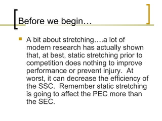 The document discusses dynamic warm-up and stretching techniques, highlighting that static stretching may not be effective for performance or injury prevention before competition. It emphasizes the importance of dynamic and specific stretching, while introducing various types of stretching such as active, passive, and proprioceptive neuromuscular facilitation (PNF) stretching techniques. Additionally, it outlines effective warm-up routines that include light aerobic work and dynamic stretches tailored for specific sports.