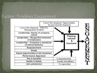The document discusses the importance of employee engagement and its impact on organizational success, highlighting that engaged employees are significantly more productive. It outlines various strategies for fostering engagement, such as recognizing employee achievements, providing training opportunities, and creating a supportive company culture. Furthermore, it emphasizes the role of value-based management in aligning organizational goals with employee satisfaction to improve retention and overall performance.