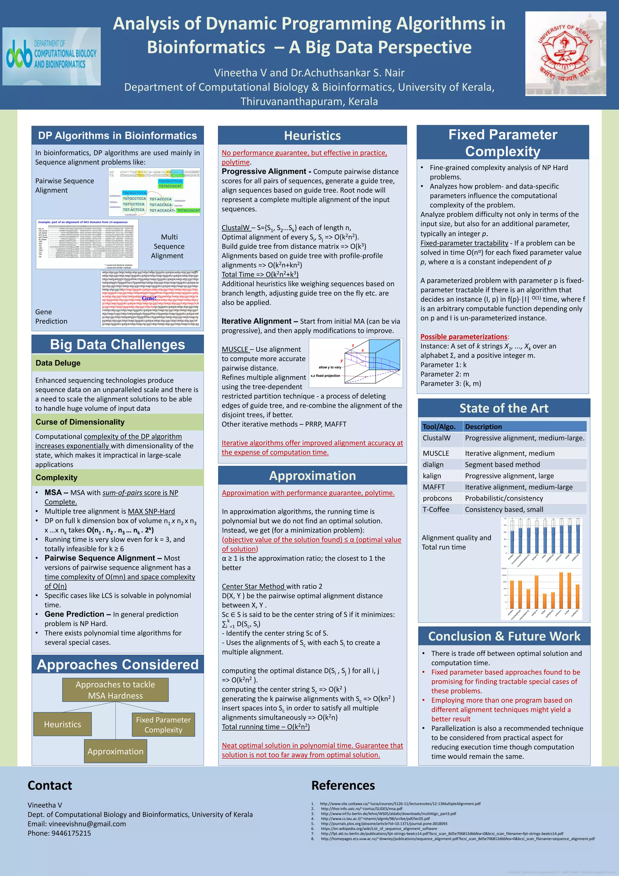 This document summarizes dynamic programming algorithms used for sequence alignment problems in bioinformatics and some of the challenges they face at large data scales. It discusses algorithms for pairwise sequence alignment, multiple sequence alignment, and gene prediction. While dynamic programming provides optimal solutions, the algorithms have high computational complexity that limits their application to big data problems. The document then covers approaches to address this, including heuristics, approximation algorithms, fixed parameter tractability, and parallelization.
