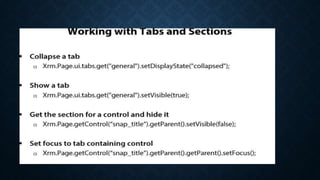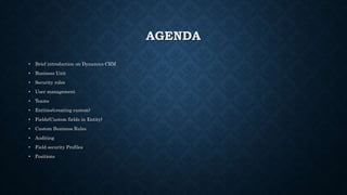Dynamics CRM document covers many topics related to customizing and extending the functionality of Dynamics CRM including: creating custom entities and fields, form and view customization, entity relationships, business rules, plugins, workflows, and connecting CRM to external systems using SSIS. The agenda covers areas like security, user management, and administration as well as development topics such as client-side scripting, CRUD operations, and advanced querying.