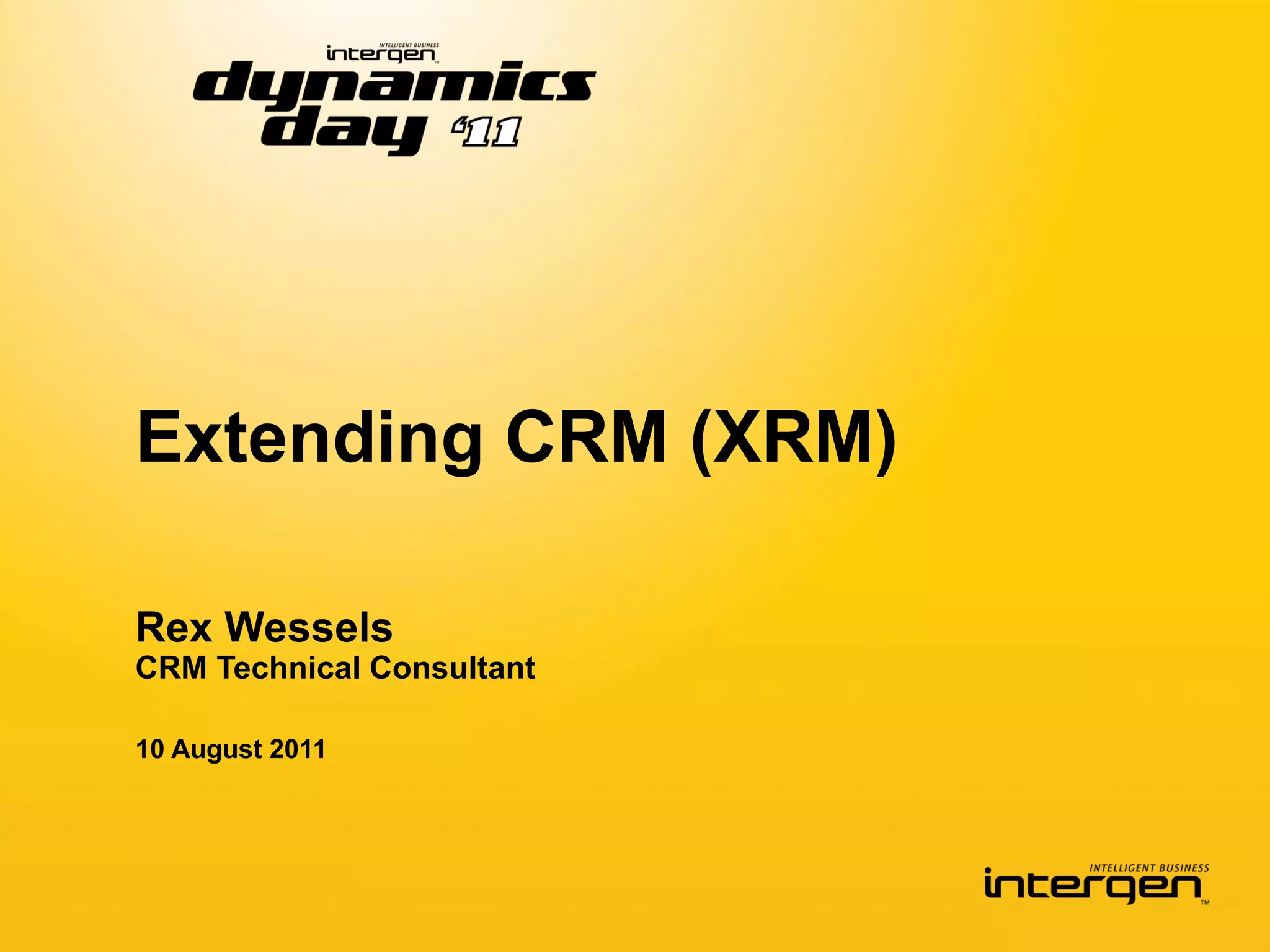 The document discusses the partnership between Microsoft and Intergen, focusing on the development and demonstration of CRM 2011. It highlights various integrations and features such as Azure, Bing Maps, and SharePoint, along with workflows and social functionality. The presentation emphasizes rapid delivery and continuous improvement driven by strong collaboration with Microsoft.