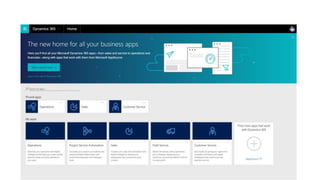 The document discusses Microsoft Dynamics 365 and its features. It describes how Dynamics 365 provides a common application platform with PowerApps, Microsoft Flow, and a common data model. It can connect different business systems and data sources. Dynamics 365 includes solutions for sales, customer service, field service, operations, and more. It also discusses how users can consume Dynamics 365 through different pricing plans and licences. For existing Dynamics users, it explains they have a choice to stay on their current version or transition to Dynamics 365.