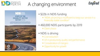 The document outlines the adaptation of disability support providers to funding changes within the NDIS framework, emphasizing the need for financial stability and efficient service delivery. It details the integration of Microsoft Dynamics 365 solutions that enhance operational processes, such as mobile service scheduling and billing automation. The focus is on improving client engagement and service management while ensuring scalability and cost-effectiveness in a competitive environment.