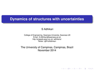 This document discusses dynamics of structures with uncertainties. It begins with an introduction to stochastic single degree of freedom systems and how natural frequency variability can be modeled using probability distributions. It then discusses how to extend this approach to stochastic multi degree of freedom systems using stochastic finite element formulations and modal projections. Key challenges with statistical overlap of eigenvalues are noted. The document provides mathematical models of equivalent damping in stochastic systems and examples of stochastic frequency response functions.