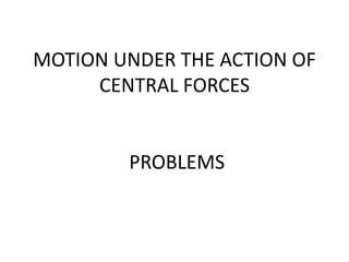 This document contains 5 problems related to motion under central forces. Problem 1 involves a particle inside a rotating tube and derives an expression for the distance of the particle over time. Problem 2 finds the law of force for a curve defined by r^n = a^n cos(nθ). Problem 3 finds the law of force for circular motion. Problem 4 finds the law of force, velocity, and period for elliptical motion under a central force directed toward the focus. Problem 5 shows that motion under a central force where velocity equals circular motion at the same distance results in an inverse cube law of force and an equiangular spiral path.