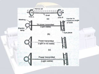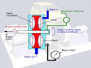 This document discusses different types of dynamometers used to measure torque and power. There are two main types: absorption dynamometers and transmission dynamometers. Absorption dynamometers measure power by absorbing it, with examples being the Prony brake, rope brake, and hydraulic dynamometers. Transmission dynamometers measure torque transmitted through a shaft using mechanisms like belt drives, epicyclic gears, and measuring the torsion or angle of twist in the shaft.