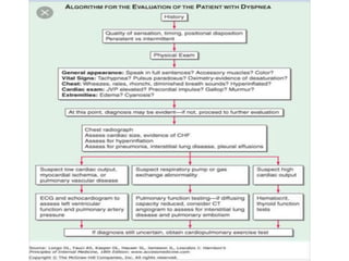Dyspnea, or shortness of breath, is a subjective sensation indicating potential disorders due to inadequate ventilation or insufficient oxygen levels in the blood. It arises from a mismatch in signaling between the brain's assessment of respiratory needs and actual ventilation performance, involving physiological and psychological factors. Various causes include cardiac conditions, pulmonary diseases, and non-cardiac/non-pulmonary factors, with management strategies focusing on stabilizing the patient and addressing underlying issues.