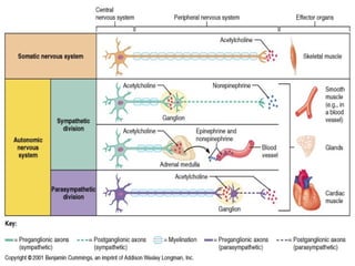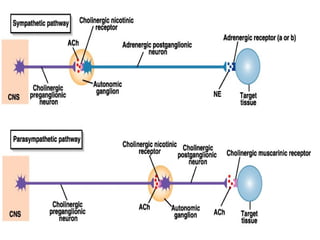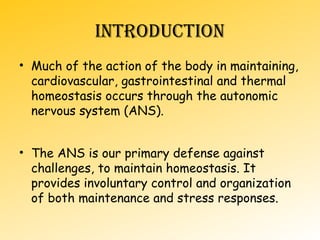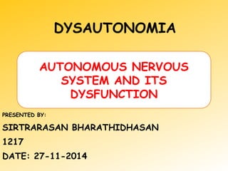 Dysautonomia refers to a malfunction of the autonomic nervous system that controls involuntary body functions like heart rate, blood pressure, digestion, and sweating. The document discusses the anatomy and functions of the autonomic nervous system and its divisions. It then defines dysautonomia and lists various causes like diabetes, multiple sclerosis, and injuries. Common symptoms involve fatigue, dizziness, digestive issues, urinary problems, and temperature regulation difficulties. Tests of autonomic function are described that measure responses like heart rate and blood pressure during maneuvers to identify autonomic dysfunction.
