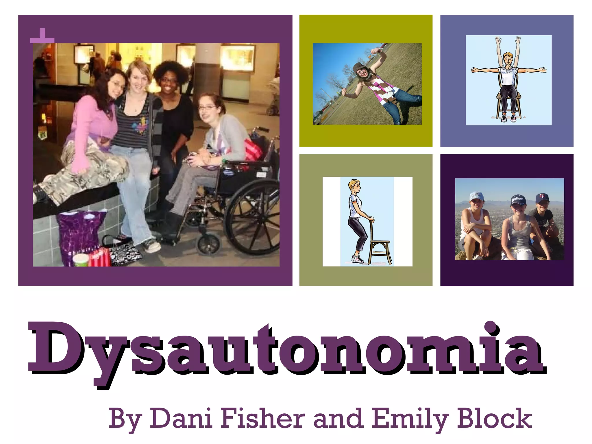 The document provides information about dysautonomia and postural orthostatic tachycardia syndrome (POTS). It defines dysautonomia as a dysfunction of the autonomic nervous system, which controls involuntary body processes. Common POTS symptoms include nausea, fainting, lightheadedness, anxiety, and abnormal heart rate and blood pressure when standing. The causes are often unknown but may include viral infections or injuries. Diagnosis involves tilt table tests and other medical exams. While there is no cure, treatment focuses on lifestyle changes, medications, hydration and exercise to manage symptoms.