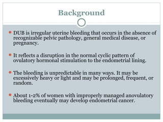 Dysfunctional uterine bleeding (DUB) is irregular bleeding that occurs without recognizable causes in the absence of pregnancy. It results from disruptions to the normal hormonal patterns that regulate the uterine lining. Bleeding episodes with DUB can be unpredictable in terms of duration, frequency, and amount. Laboratory tests and imaging studies are used to diagnose DUB and rule out other causes by examining thyroid function, prolactin levels, and pelvic imaging. Treatment involves pharmacologic options like oral contraceptives, estrogen, or progestins to suppress bleeding or reestablish normal cycles. Hysterectomy may be necessary for patients who do not respond to hormone therapy or experience quality of life issues from persistent bleeding.