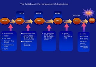 The document discusses guidelines for managing dyslipidemia and cardiovascular disease risk, including: