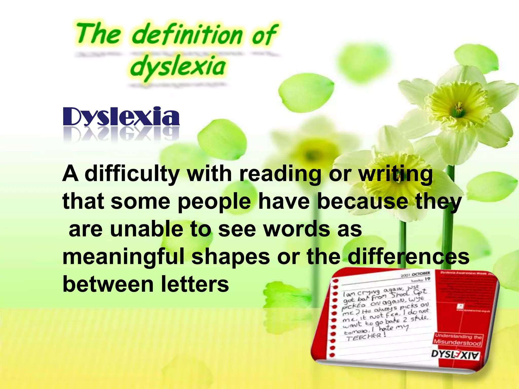 Dyslexia is a difficulty with reading or writing that makes it hard for people to see words as meaningful shapes or distinguish between letters. There are different types of dyslexia related to irregular word reading, connecting sounds to symbols, or both deficits combined. Dyslexia is caused by brain defects and genetic factors. Doctors can examine children if parents notice problems reading by age 6-8. Diagnosis involves sensory, psychological, and skills evaluations. Symptoms include letter/number confusion, poor spelling, and issues with phonological awareness. Solutions include specialized teaching methods, assistive technology, extra time for tests, and activities to make learning letters fun.
