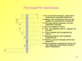 Розгадайте кросворд 1.Кут в оптичних явищах, який часто позначають грецькою буквою α; 2. Явище, яке спостерігається під час падіння на дзеркальну поверхню; 3. Світлове явище природи, що має звуковий супровід; 4. Штучне джерело світла; 5. Тіло, що відбиває світло, «краще» за всі інші; 6. Лінія, вздовж якої поширюється світло; 7. Випромінювання, яке сприймає людське око; 8. Простір, куди не попадає світло від джерела; 9. Зміна напряму поширення світла під час переходу через межу розділу двох середовищ 9 8 7 6 5 4 3 2 1