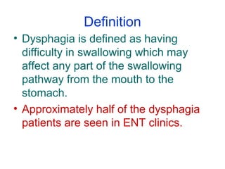 Dysphagia is difficulty swallowing that can affect any part of the swallowing pathway from the mouth to the stomach. It is commonly seen in ENT clinics. There are two main types - oropharyngeal dysphagia involving preparation and transport of food in the mouth and throat, and esophageal dysphagia with food sticking in the lower throat or chest. Causes vary by age from foreign bodies in children to malignancy in the elderly. Evaluation involves history, examination, barium swallow, endoscopy and manometry. Treatment depends on the underlying cause but may include dilation, stenting or surgery.