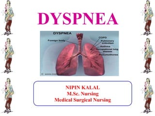 Dyspnea, meaning difficult or painful breathing, is defined as an uncomfortable need to breathe or an abnormal awareness of breathing. It can be caused by conditions affecting the upper airways, lungs, heart, chest wall, or metabolic issues. A health history and physical assessment are used to evaluate potential causes, while diagnostic tests may include chest x-rays, pulmonary function tests, echocardiograms, and blood gas analysis. Treatment focuses on the underlying cause, while nursing management includes positioning, oxygen therapy, breathing exercises, and addressing anxiety.